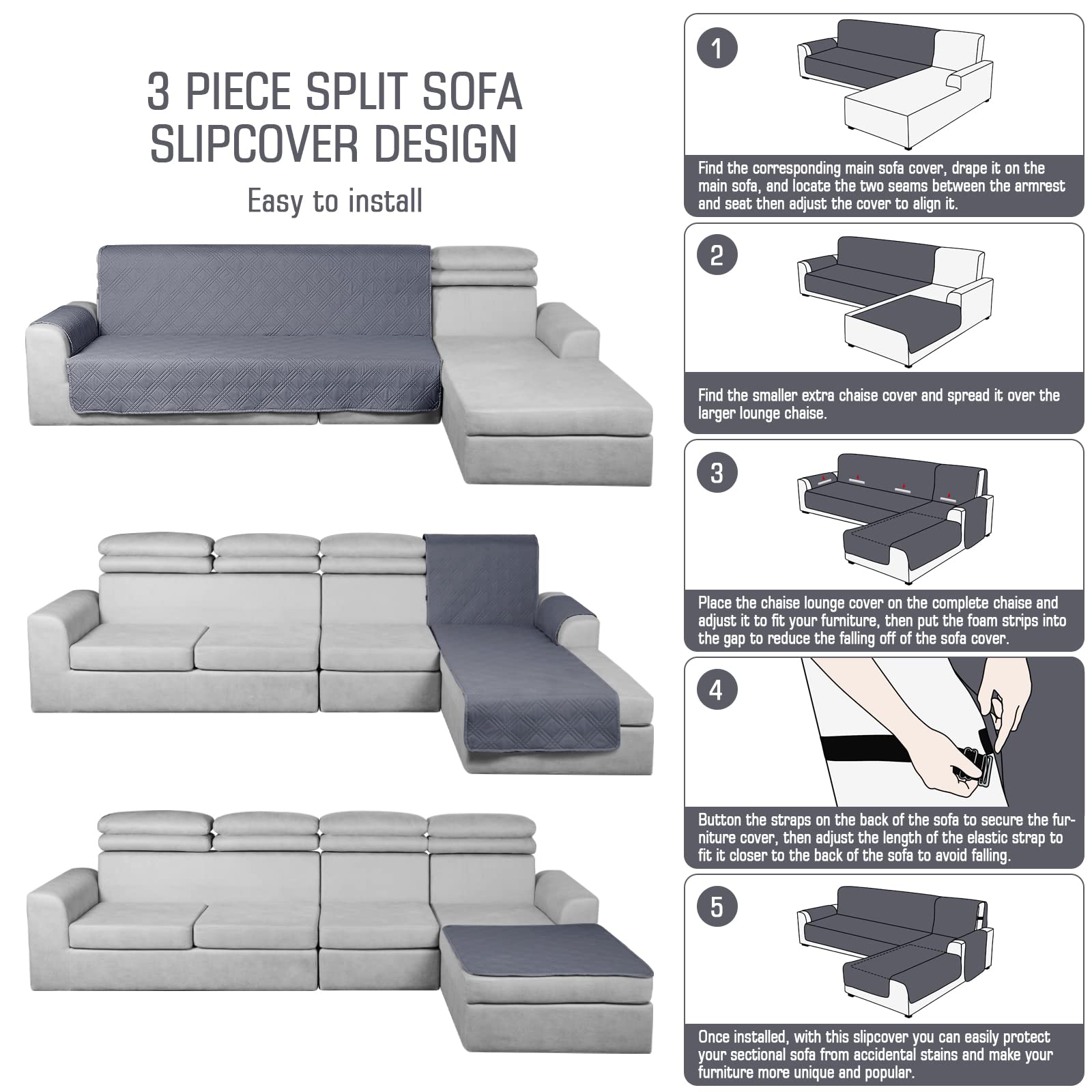 • Perfect fit design: This sectional couch cover is specially designed for your personal sectional/L shaped sofa. It is made up of three pieces, two of which are for the main sofa and lounge chaise. The additional chaise slipcover is designed to cover some of the larger lounge chaise or other uses if needed; Bringing supplementary protection to your new sofa.