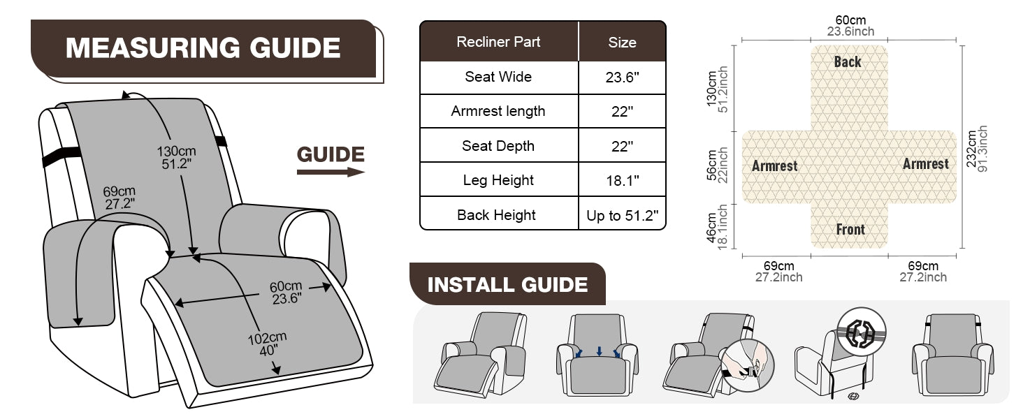 Crafted from high-quality, durable materials, our chair cover not only guarantees complete waterproof protection but also ensures a snug fit. The innovative design features adjustable straps and a secure backing, allowing you to easily customize the fit to your recliner's dimensions. No more worrying about accidental spills from drinks or food - simply wipe off any mess and enjoy your seating without stress!