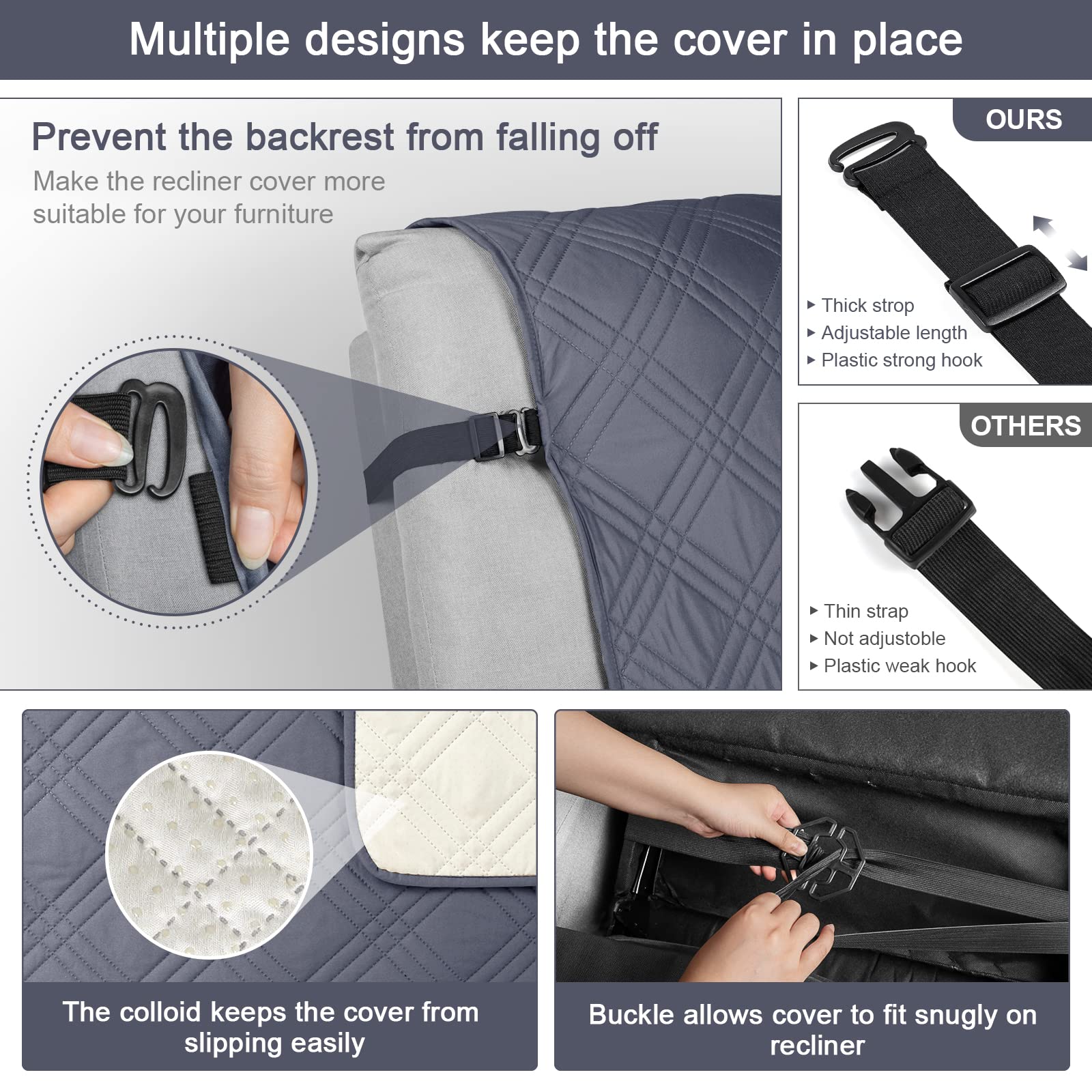 - 【REDUCE SLIP-OFF CONCEPT】Reduce movement around! 1. Solid round colloid design on the back of our recliner cover; 2. Additional flexible elastic straps; 3. Two elastic bands at seat's back side and the matching buckle, to reduce the sliding of the recliner chair slipcover, even on the leather furnitures.