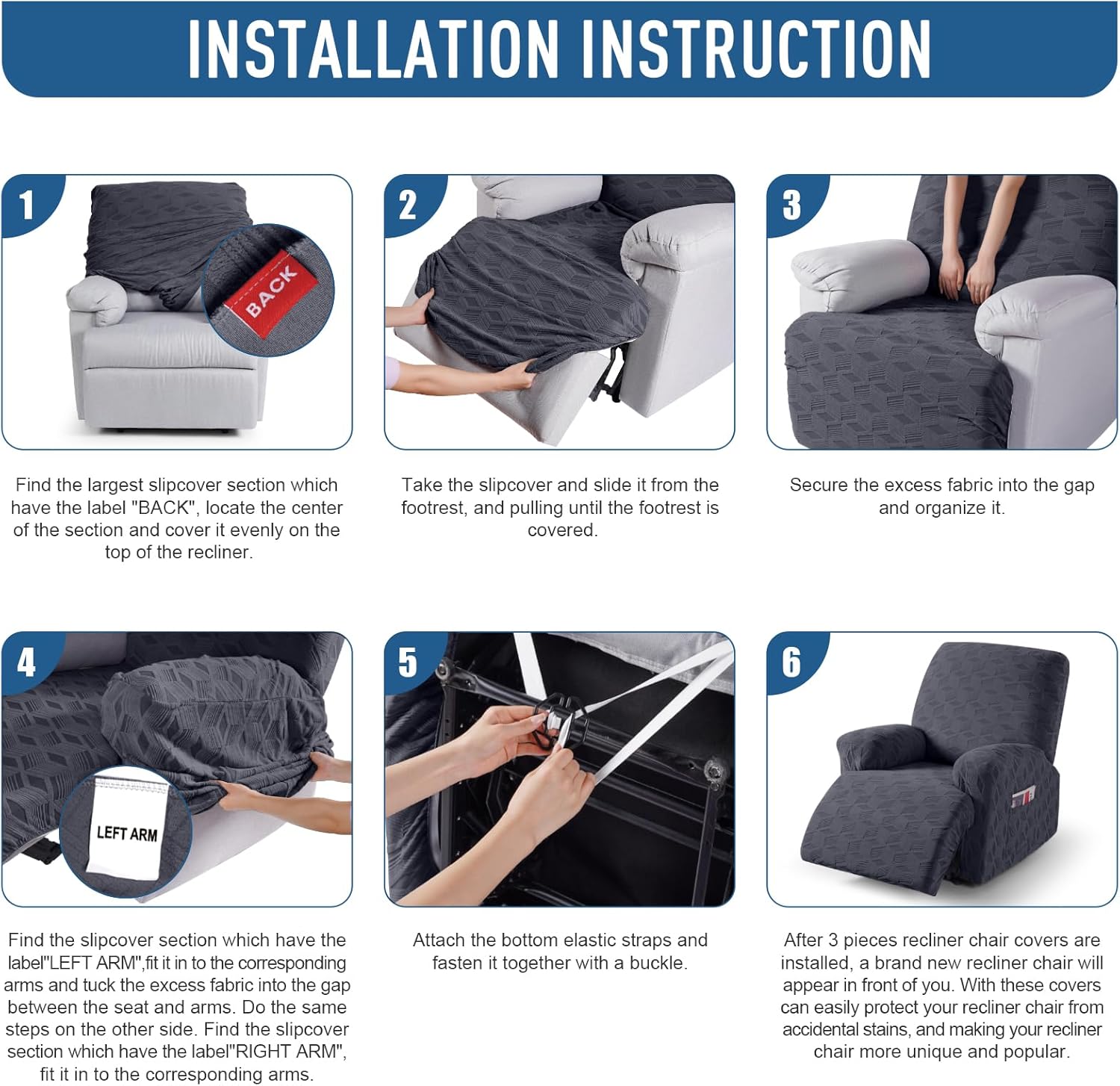Installation is simple and straightforward. Just slip the cover over your selected recliner, adjust the fit, and you’re done! The non-slip feature ensures that the cover stays in place, providing a hassle-free solution that doesn’t sacrifice comfort or style. With our Stretch 3 Pieces Recliner Chair Covers, you can easily refresh your seating area for any occasion—be it hosting a family gathering or simply enjoying a quiet night in.
