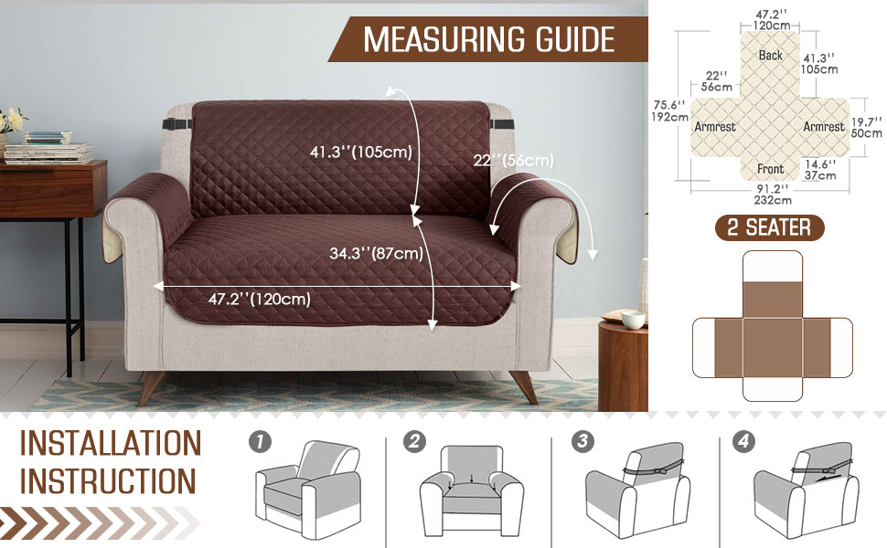 - 【SUITABLE FOR MORE SIZES & TYPES】: There are four sizes of couch cover available that will fit most family sofas. TAOCOCO Loveseat Cover for the size is 47.2'' (120cm). It can be compatible with most of the furniture with loveseat or two-seater sofas. Follow the detailed information about the measurement guide. NOTE: Please confirm the size before purchasing. Fabrics had non-slip designed and therefore recommended for use on whatever fabric or leather furniture.