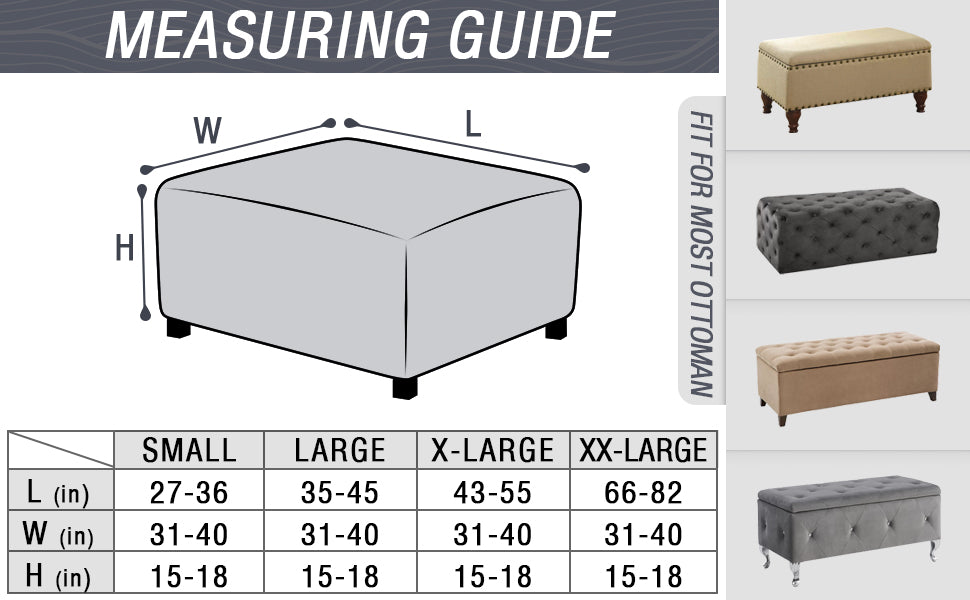 - Measure Size. Small size length between 27"-36", Large size length between 35"-45", X-Large size length between 43"-55", all the width is: 31"-40", height: 15"-18". Please refer to the measurement guide in photo for more details, before choosing the right cover for you, measure your ottoman to ensure you have the perfect fit for a your living room.