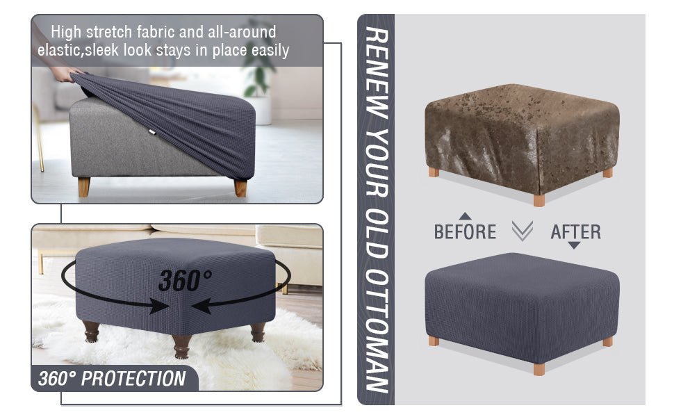 - Functional. Our rectangle ottoman covers could protect your ottoman from daily scuffs, wear and tear, stains, etc, great choice for homes with children and pets. Encase your footrest with this cover, and you'll experience a noticeable softness when you kick up your feet during your me-time. Available in many colors 4 sizes, convenient to update the look of your ottoman and match the style of your living room, making your room feel more refined and polished.
