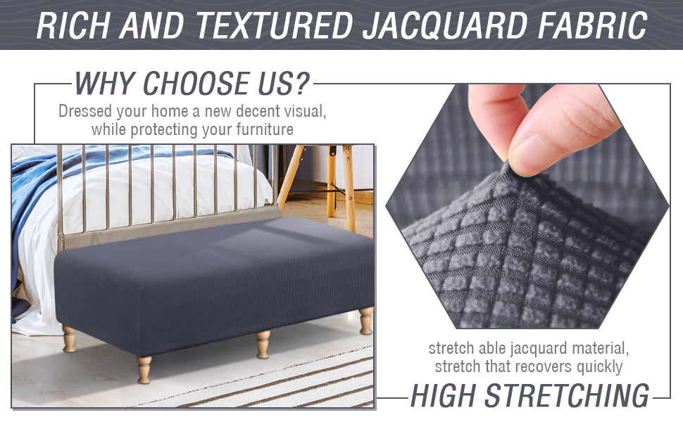 - High Quality Material. The TAOCOCO ottoman covers are jacquard knit made of 88% polyester & 12% spandex blend fabric that won't wrinkle. Super soft and comfortable to touch, stretchy thick fabric slipcovers are really worked to cover the rectangle ottoman and durable enough for many years use.
